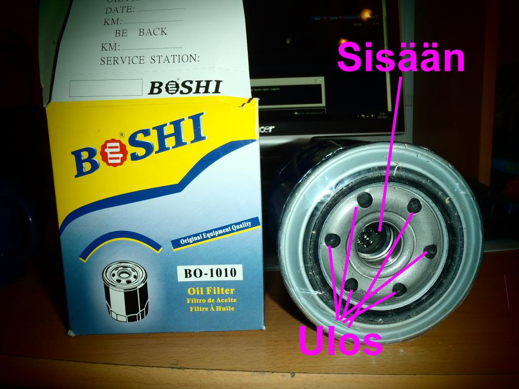 Ja jos väärä suodatin, niin tuosta suoraan öljypohjaan menevästä reiästä karkaa osa suodatettua öljyä takaisin öljypohjaan.