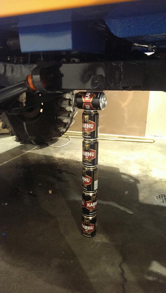 |   Pönttö-UAZ. Runko on korkealla, jakis roikkuu pari tölkkiä alempana.
