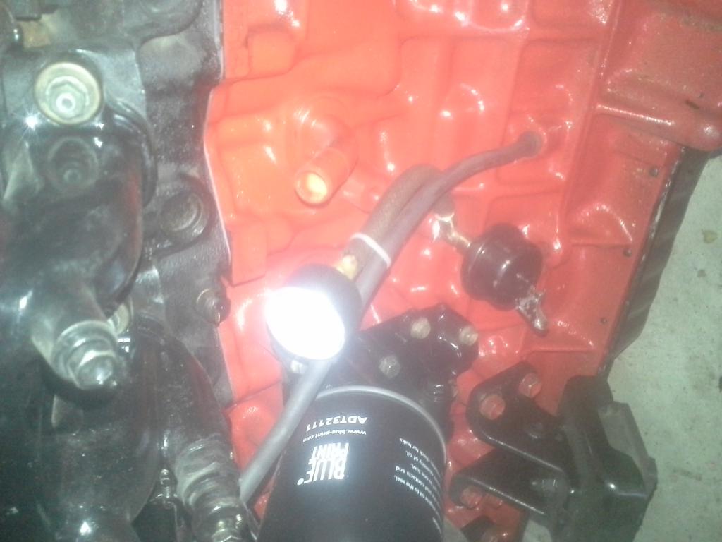 Öljypumpun siemennykseen piti kehitellä käteen sattuneista tarvikkeista tuollainen hi-tech öljypumpun siemennyslaite, kun pelkällä tratilla ei öljy valunut riittävästi pumppuun. Tuohon kuvassa oikealla (oikeasti siis alhaalla) 10 mm pultti kuusiokolokannalla,johon tuuppasin. Paineet nousi siihen asti, kunnes havaitsin löysän banjon ja rasvasin lattian siinä sivussa. Eniwei, nyt on öljyt kanavassa ja senkin puolesta käynnistysajankohta taas lähempänä..
