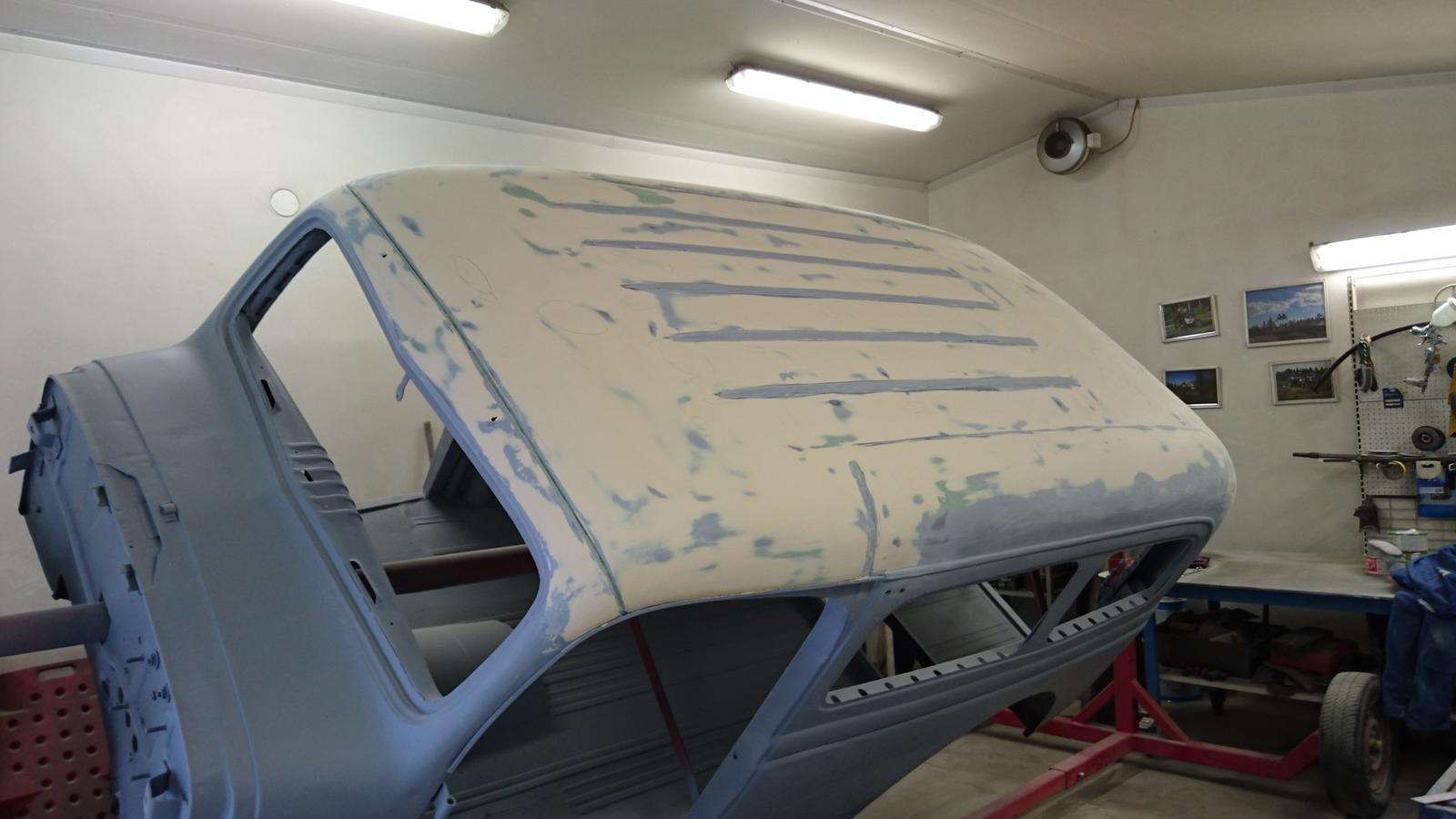 Rupee olemaan katto kitattu. Pakko oli tehä nyt kun pyörii grillissä. Pari kierrosta ensi lasikuitukittiä hitsien alueelle sekä isompiin koloihin, sitten muutama kerros hienompaa kittiä.