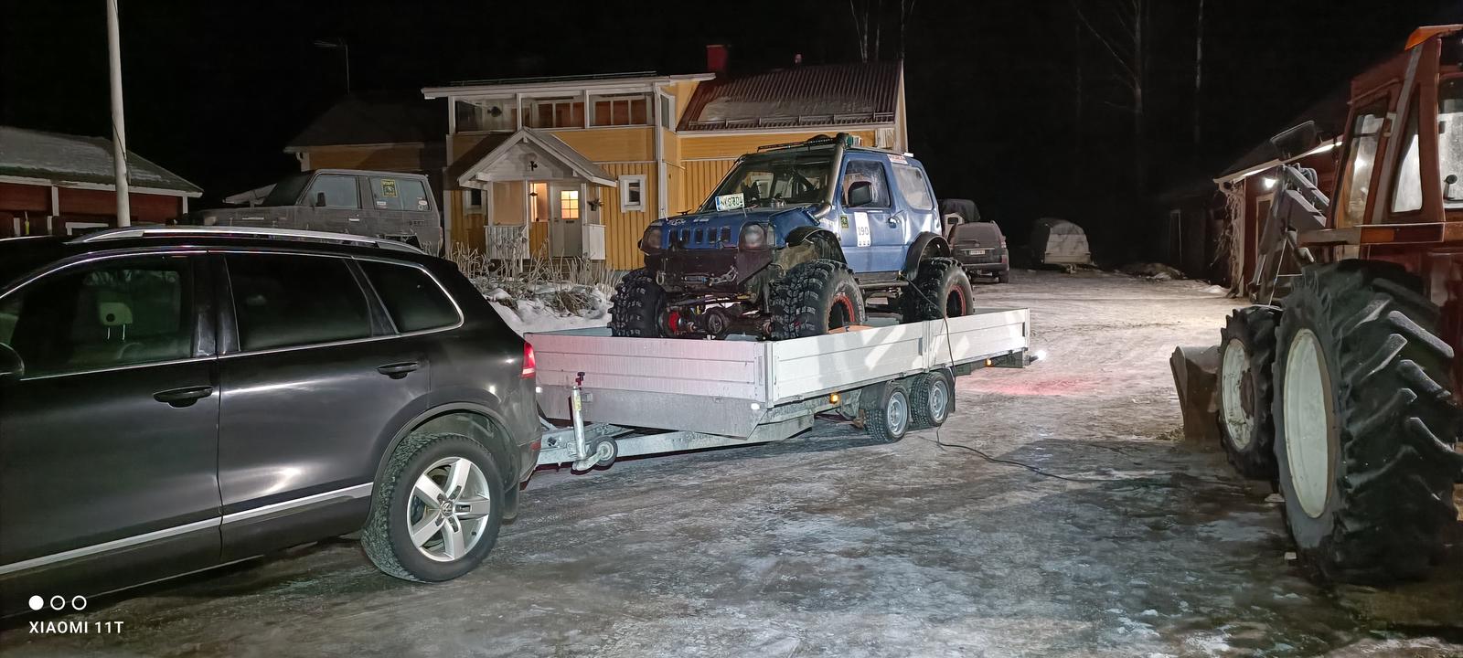 Tuli käytyä, aika nopee pyörähdys... Rapee 100 metria laavulta, ja olkavarren pultit poikki. Lainattiin toiselta puolelta pari, et sai ohjauksen takas, ja rauhallisesti trailerille. Mut tulipahan käytyä...