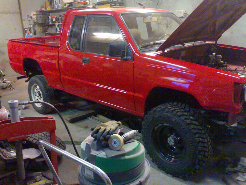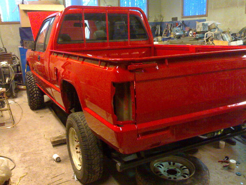 Jokos on auto valmis. Itsellä viel sama projekti kesken runko korjattu oli viel huonommas hapes kun toi. viel pitäis laatikko korjata niin pääsis kasaamaan. Ohjaus akseli ei kyl riitä 75mm korin korotuksen mut eiköhän siitä sähköliimalla selvitä. Minkä verran maalia tommonen pikapin maalaus syö.