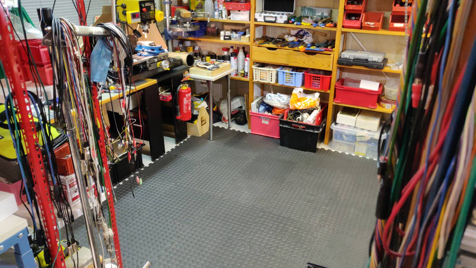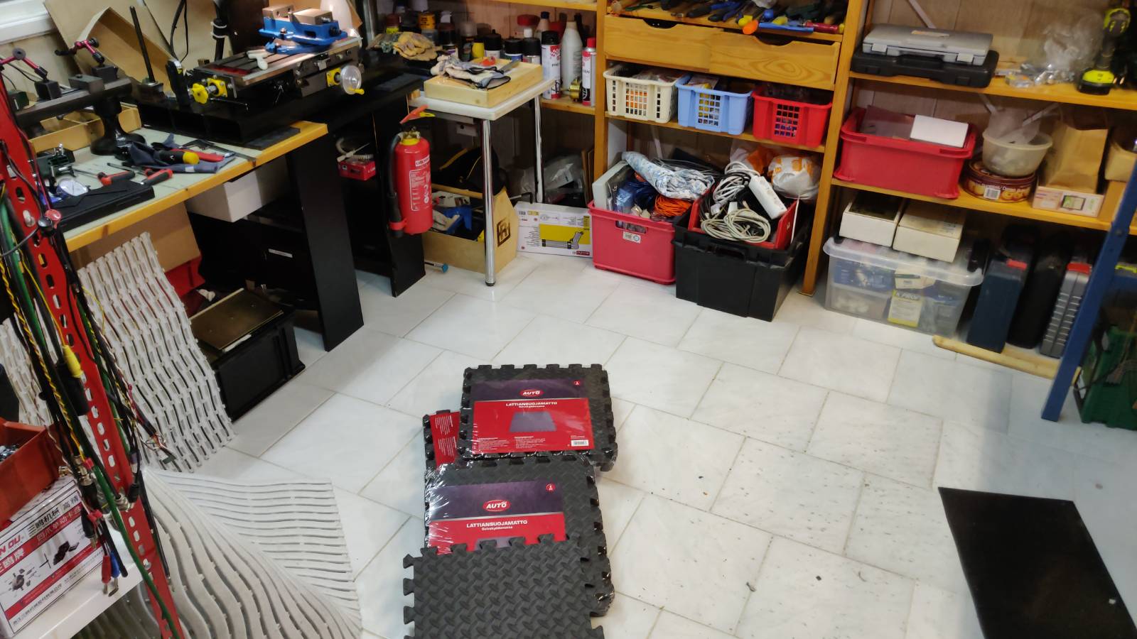 Pajan lattia on klinkkerilaattaa. Menny jo useasta kohdasta rikki putoavien kamojen alla. Rikkoo myös putoavat osat. Pitkään miettinyt jotain tällaista pehmeää pintaa siihen. Nyt sattui kohdalle. Tuntuu lisäksi jalkojen alla miellyttävältä. |