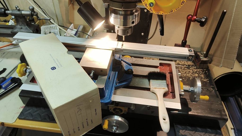 DRO on tietenkin kiinankaupasta. Aikani tutkittua tarjontaa tartuin Sino-merkkiseen pakettiin. Lienee jonkinlainen kiinan brandi. Juutuubin oikeat konepajaukotkin näyttävät käyttävän näitä. Asennus alkoi pitkittäiskelkan mittakepin asennuksella. Aikalailla suoraviivainen komma. Keppi runkoon kiinni ja vähän osia jyrsinkoneella, että saa anturin liikkumaan kelkan mukana. Mittakelloa vastaan mittaa oikein. |