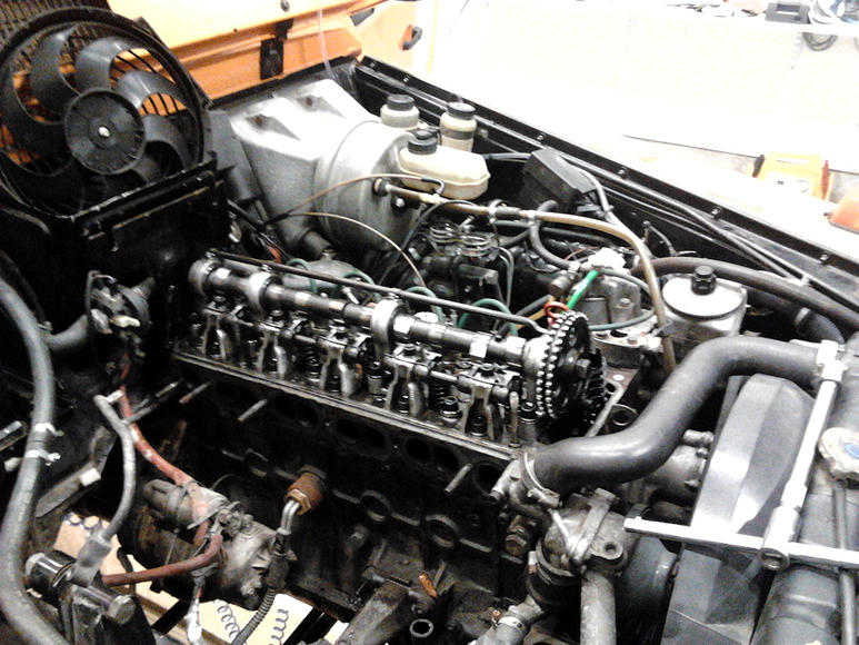 Tulipas sit aktivoitua oikein kunnolla... Homma lähti liikkeelle ku eilen aamulla tuli siirtokehoitus G:lle faijan duunin pihasta. Noh monta puhelua myöhemmin ja yhtä hinausautoa myöhemmin auto tuli tänään työpäivän päätteeks duunipaikan halliin. Kun ei kerta muutakaan tekemistä ollut perjantai-iltana, niin tuli hiema purettua konehuonetta. Voin muuten sit kertoa, et kaikki jotka aikoo laittaa hienon lämpösuojapellin turbon päälle ja asentavat sen kun kone on vielä pukissa kiinni, niin suosittelen ottaa sit sen moottorinosturin metsään mukaan. Ei mennyt kuin 1,5h irroittaa 3 pulttia et lähti irti ja sai loput kiinnitykset irtoamaan. Parkkipaikalla pimeässä sormikopelolla tehty syväluotaava vika-analyysi osu muuten 100% oikeaan eli nokkaketju mennyt poikki ja oli nätissä sykkyrässä lohkon sisässä. Laitetaan kuva tän illan saavutuksista, eli turbohilut ja sarjat irrotettu.
