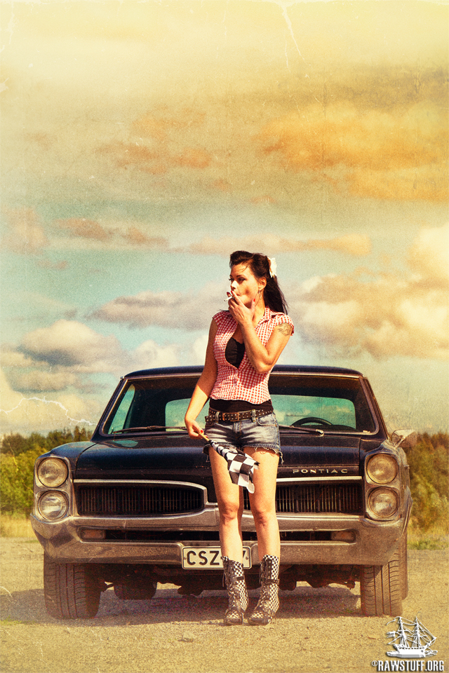 upea, sopivasti retro kalenterimainen kuva, kaikki kohdallaan, nätti tyttö, nätti maisema ja nätti auto, ja tuo tupanGi tekee tytöstä sopivasti "tuhman" oikein hyvä, täydet pisteet ja jatkoon