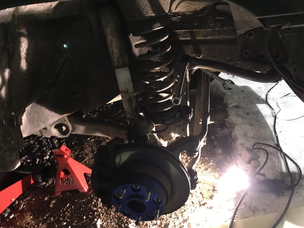 Noniin, ei pystynyt enää katselemaan noita BB liftereitä hyllyssä vaan oli pakko saada alle ne. Hanttarin puolessa meni varmaan tunnin verran, kun oli vakaajan pultit sen verran juntturassa ja jouduin kuitenkin käyttään jousipuristimia että sain jousen takaisin paikoilleen. Pois tuli kyllä kivuttomasti. Kuskin puolella taas meni takaisin paikoilleen ilman puristimia, liekö auto ollut sitten sen verran kallellaan että kuskin puoli napa pääsi alemmas.. Tämä olikin sen verran helppo operaatio, että olis voinut aiemminkin suorittaa pois...