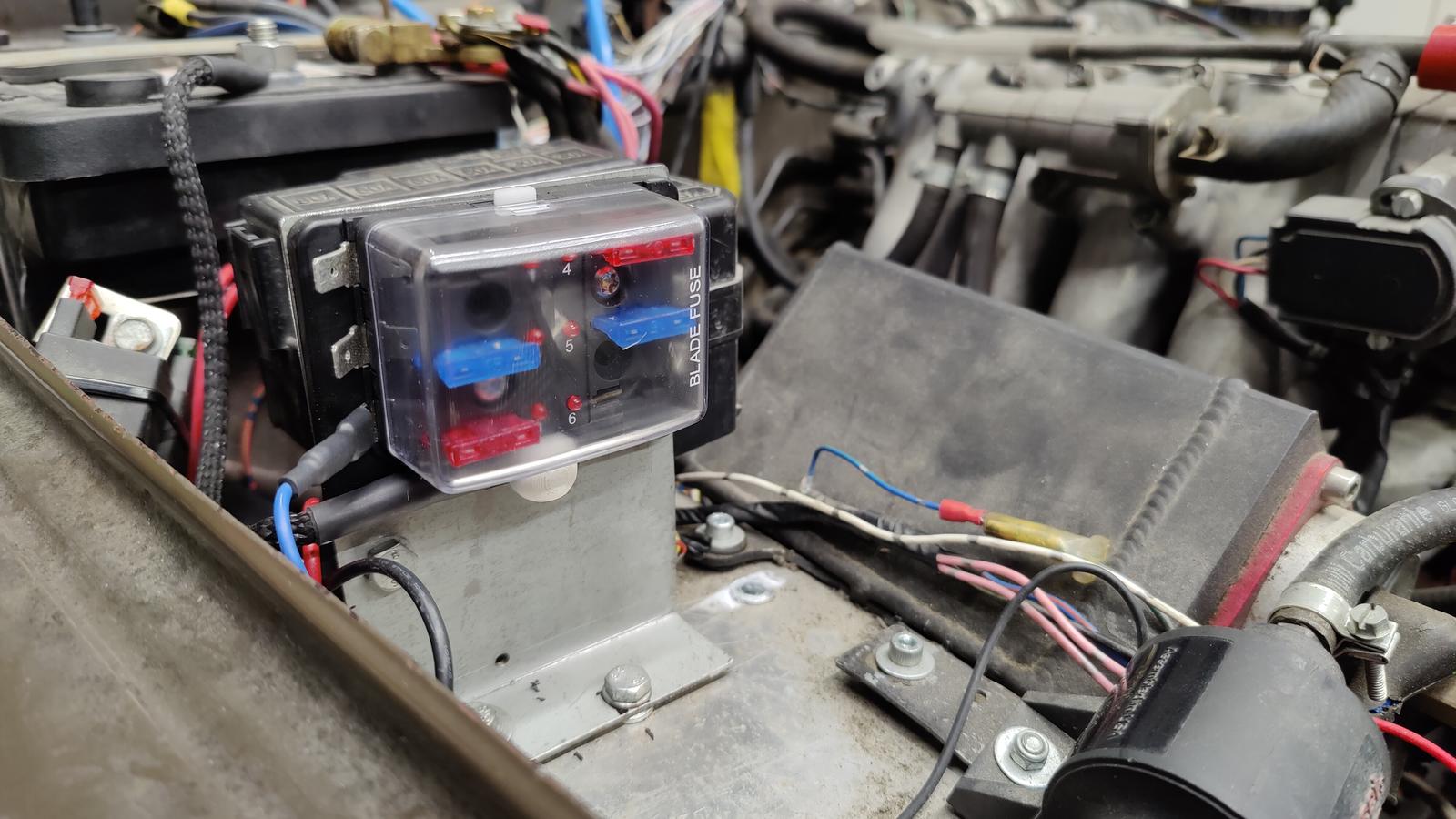 Ei nyt se kaunein asennus, mutta piuhan reititys oli aika mukava. Tuolla sulakerasian luona on sitten liitin, ettei valopalkkia tarvitse ihmeemmin purkaa jos konepellin ottaa pois. Sulakerasialle löytyi paikka pääsulakerasian vierestä. Tähänkin akulta lyhyt pätkä paksua johtoa, joten se sujahti suojasukkaan. Sulakerasialle tuleva pultti oli aika hyvin tyrkyllä, joten siihen tuli printtailtua tuommoinen hattu suojaamaan. Valaisee eteenpäin jo enemmän kuin tarpeeksi. Seuraavaksi sitten valorintamalla sivuille sojottavaa valoa lisää.