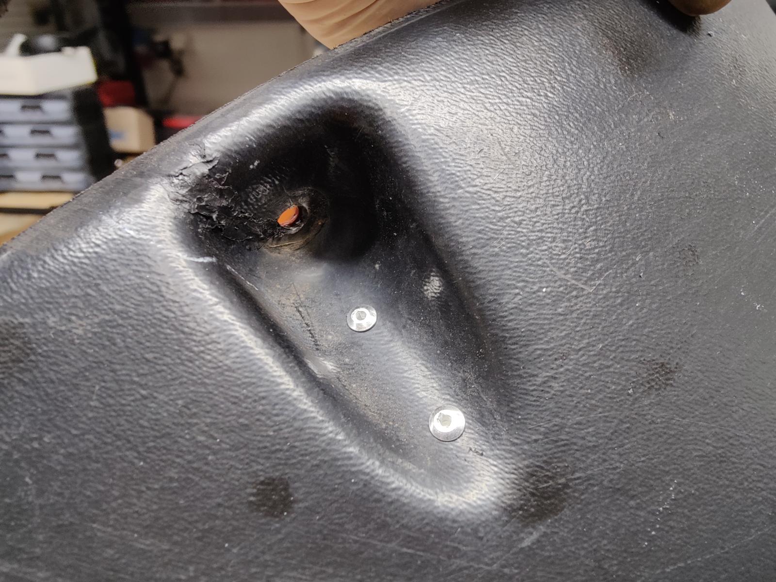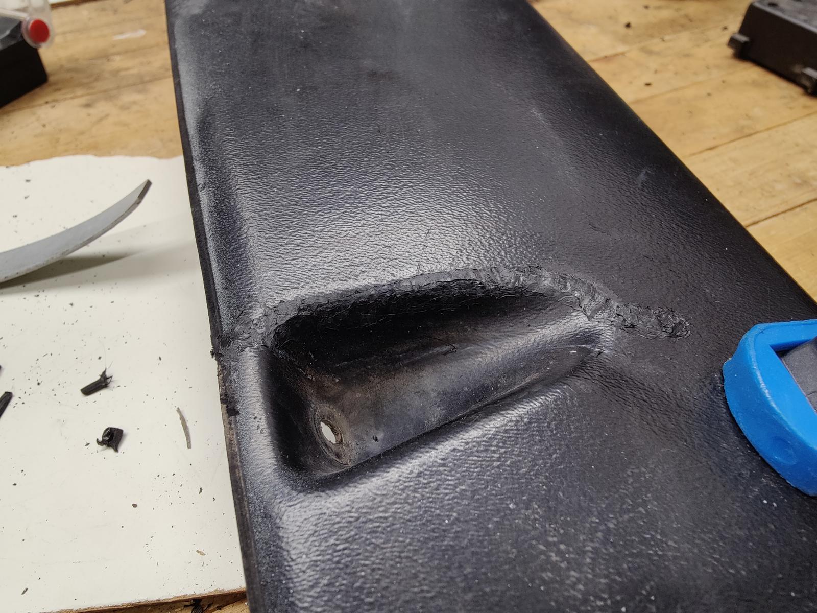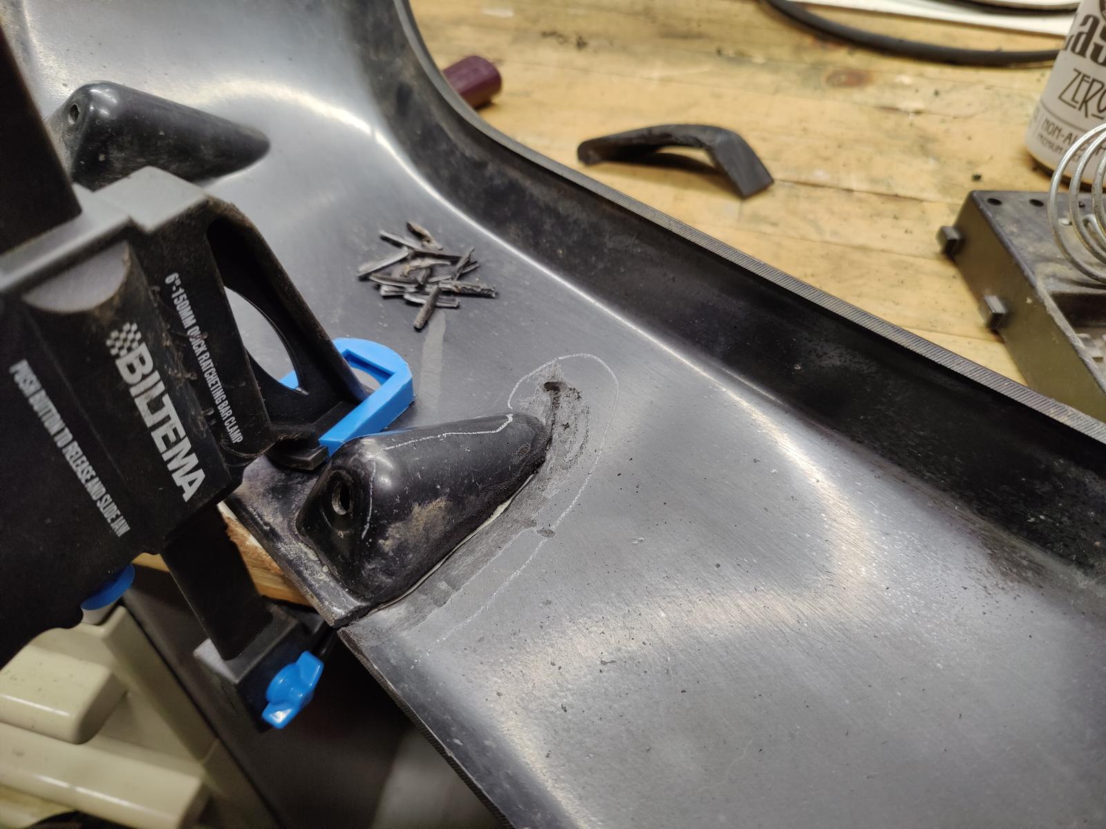 Sen sijaan muovihitsaus korjausmenetelmänä tällä kertaa. Trimmasin molemmat levikkeet tasamittaan ja käytin trimmauksesta jäänyttä muovia täyteaineena. Railoja auki ja kurat välistä pois, kuumailmapuhaltimella ympäristöä lämpimäksi ja pinsettien avulla täyteaineen pehmennys ja railoon. Lämmittelin materiaalia sen verran, että täyteaineen pala alkoi tarttumaan ja sen jälkeen viimeiselin kolvin kärjellä tasaiseksi. Molemmin puolin sauma, niin todennäköisyys pitävälle saumalle vähän parempi Kiinnityspisteistä oli aika moni riekaleina, joten peltilappua vahvikkeeksi. Tähän vielä kuumaliimaa muovin ja pellin väliin siten, että ensin muovin pintaa liekitin pikaisesti (oletettu pintaenergian kasvaminen) ja kuumensin peltilappua samalla kun tursotin liimaa (liimaliitoksen lujuus / tartunta parempi mitä hitaammin liima jäähtyy) Liimaklönteistä ei tarttunut kuvaa, mutta noihin vielä maalia suihkaukset päälle. Päältäpäin tuli kohtuullisen siisti, vain noi popparit ja viimeistelemättömät saumat paljastaa korjaukset. No nekin peittyy kuraan nopeasti ![]()