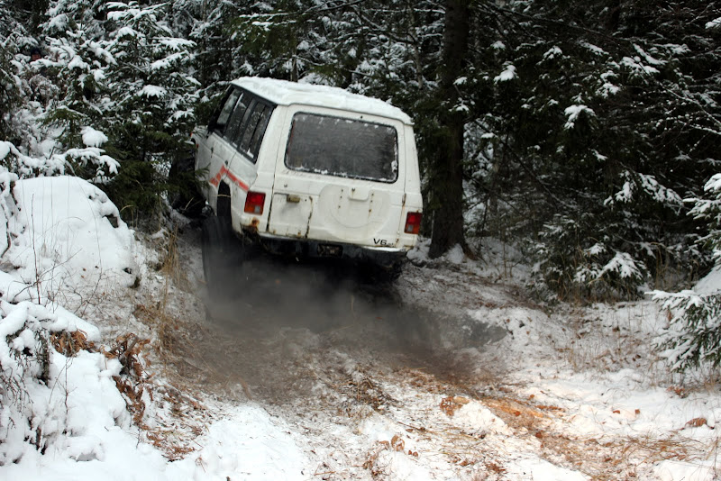 Olisinpa ollut kuvaamassa kameran kanssa aikaisemmin tuossa kohdassa. Mönkkärit vinssas sen ensin ylös. Seuraavaksi tahkosin minä Jeepillä mutta luovutin kun ei auto vaan noussut ylös. Sitten JV koitti samaa eikä patukkakaan noussut vaikka Swampperi pyöri niin perkuleesti: Varmaan lähempänä satasta olis ollu pyörintänopeus. Sitten todettiin että koitetaan vauhdilla, ja JV:hän pomppasi videon mukaisesti laakista ylös. Samanlainen yritys Jeepillä ja sekin meni heti ekalla. Perusvauhti vaan kohdalleen niin meneehän se näköjään.
