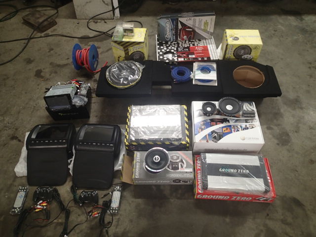 niskatukiin 9"näytöt, penkin alle pari järeää 10" ameriikan kotelo tekeleeseen , eteen 3 tie erkka sarja,taakse 5,25 koksut, soitin 7" näytöllä, pari vahvistinta..... pätkä johtoo ja aikaa.