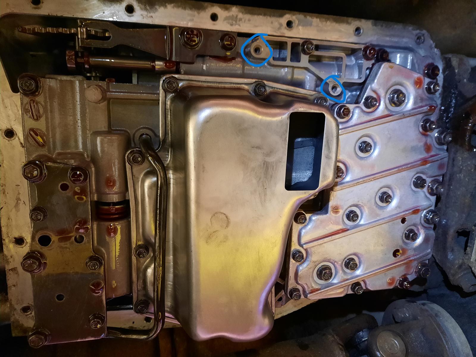 Osaako joku sanoa kuuluisiko hydraulisen A442f laatikon venttiilikoneistossa olla pultit noissa sinisellä ympyröidyissä kohdissa? Otin automaatin öljypohjan irti ja putsasin suodattimen, jonka yhteydessä tuon huomasin. Tuolla oli aikaisemminkin joku käynyt, niin jäin miettimään onko entisen sepän jäljiltä?