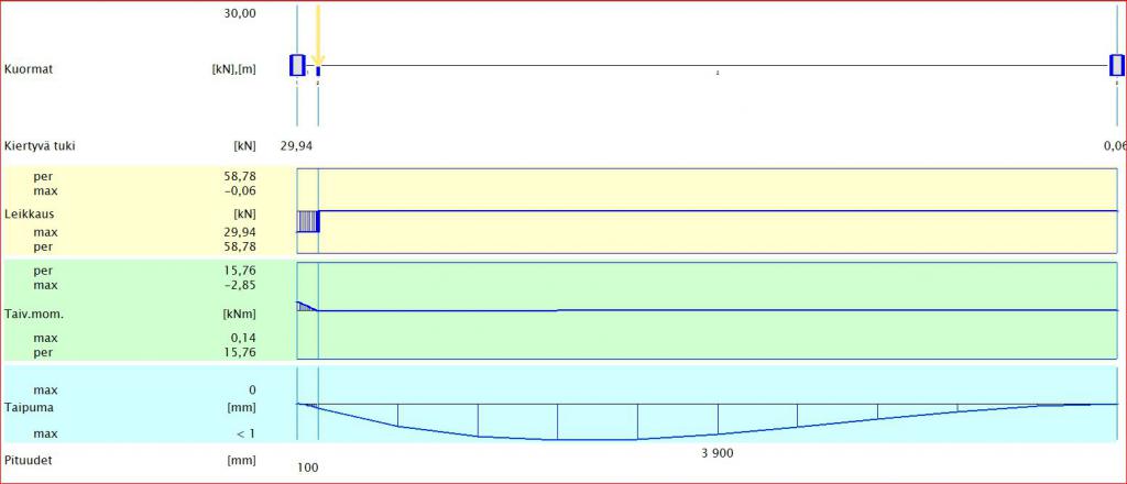 Jänneväli 3000 mm, päissä tukivoimat (siis ei kiinteää liitosta). Kuorma keskellä.