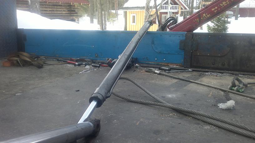 Aloittelin kunnostaan vanhaa RKP:n 2600 puutavarakuormainta. Välystä kertynyt sinne tänne ja vuotavia sylintereitä riittää. Ennestään korjattu koura sekä toisenpuolen tukijalan sylinteri. Nyt laitoin nostosylinterin. Kuormain on varustettu kahdella jatkolla. Hitaalla tyvijatkolla ja nopeammalla pikku jatkolla. Pikku jatkon purin tänään ja huollon puute tuli heti esille. Jatkopuomin kulutuspalat oli kuluneet pois aiheuttaen puomin kulumisen lähes puhki päästä. Lisäksi kun kulutus palat oli kuluneet pois pääsee jatko menemään niin liinkkuun että jatkon sylinteri oli mennyt mutkalle. Nyt pitää keksiä mistä uusi jatkopuomi. Taitaa ainoa vaihtoehtoettä korjata vanha uusimalla rautaa. Vai onko jossain joku seppä joka tekee tuollaisen kuuskulmaisen aisan??