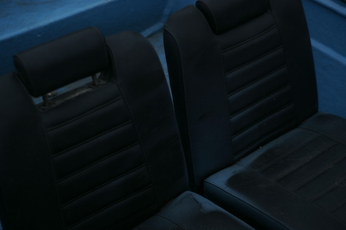 Riippuu toki minkäkokoisen koneen siihen haluaa laittaa. Perässä on vanerilevy, mutta koneen aukkoa on hieman kairattu suuremmaksi. Varmasti kestää tollaisenakin, jos ei laita mitää jättisuurta konetta. Ohessa suurennettu kuva perälaudasta. Mielestäni pohja oli ihan asiallisessa kunnossa.