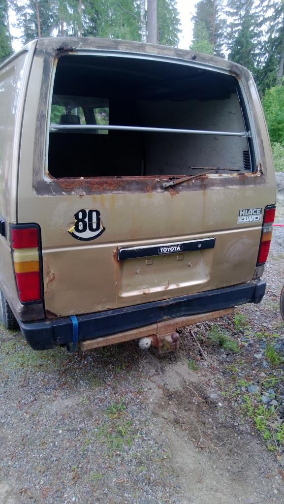 Eli liikenteestä poistettu hiace. Ei veroja perässä. Ostaessani takajouset puuttui nyt löytyy jousetkin mukaan (Nyt ois allekkin laitettu jollain lailla) Joten olisi trailerille siirtokunnossa. Alla sekarengastus. Plussaa 2+3 rekisteröity, ei veroja perässä. 3500kg:n koukku. Miinuksia ruostetta riittävästi, ei lähde käyntiin. (nissanistiä ei kiinnosta toyotaa ruuvailla) Ainaki laturin hihna irti... Oishan tässä lyhyempi välitteiset perät kuin hiluxissa...