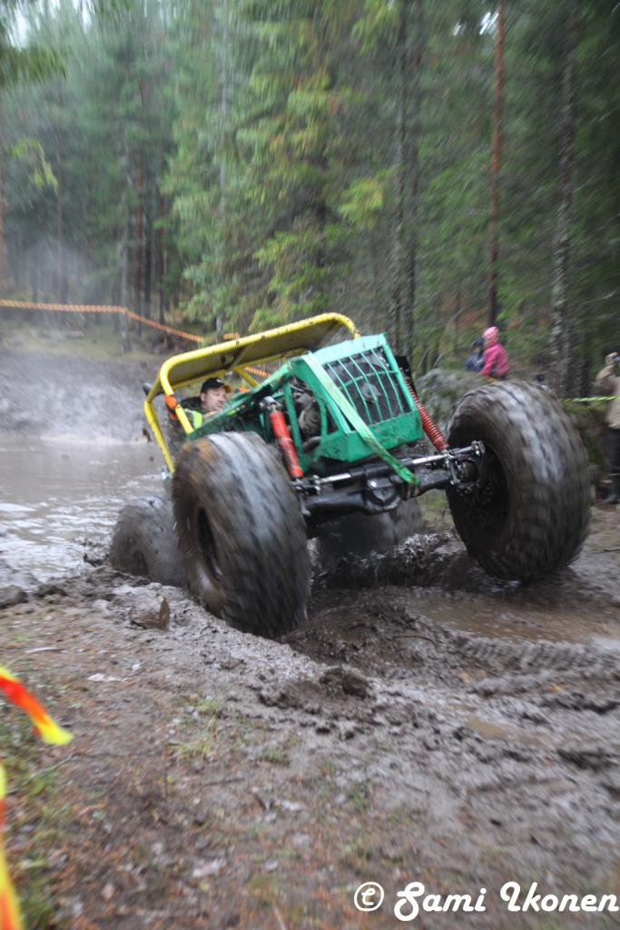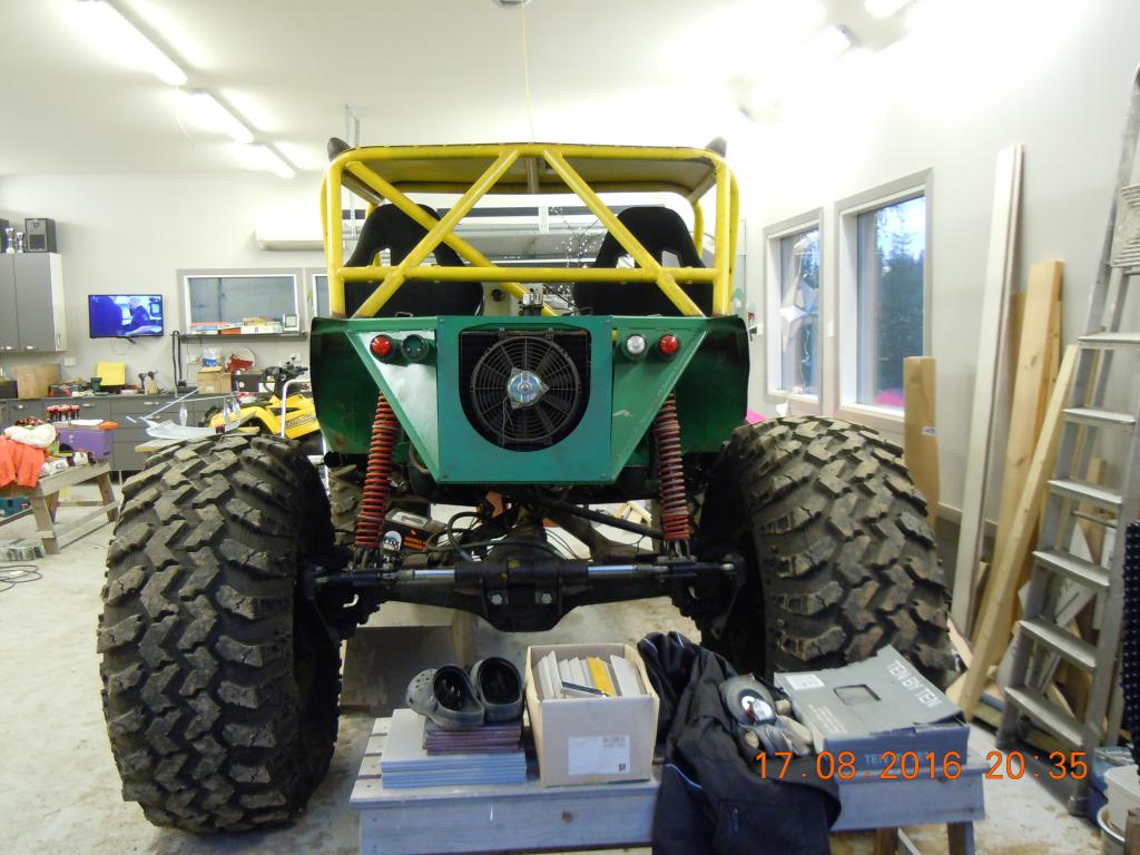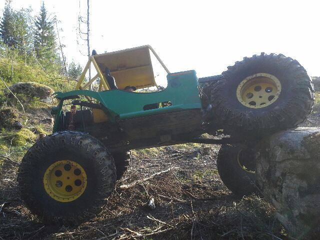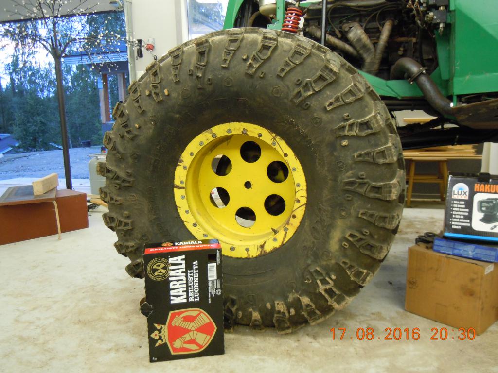 Iso mörkö renkaiden ja akseleiden hinnalla. Irokit on n. 120 cm korkeat ja puoli metriä leveät. Auto painaa täydessä varustuksessa 2440 kg. Paino jakautuu muutaman kilon tarkkuudella joka pyörälle. Punnittu poliisin vaaoilla. Alusta toimii loistavasti kiinteilläkin asetuksilla. Viimeisessä kuvassa eturengas 1.2m korkean kiven päällä ja muut tassut tukevasti maassa. Autoon löytyy myös bolt on NP jakis jos haluaa lisää vauhtia.