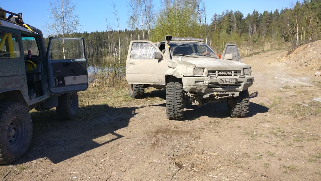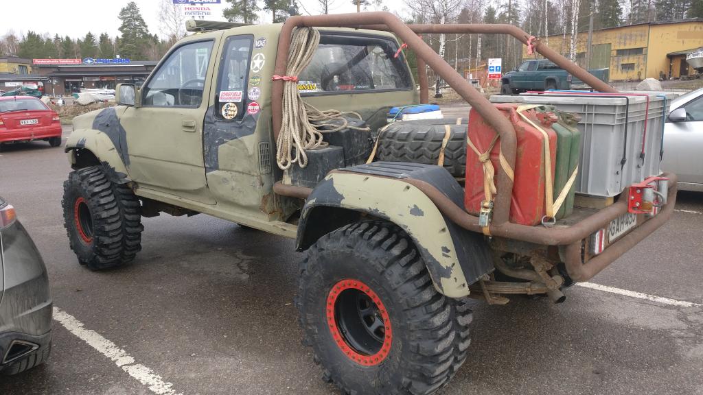 Hilux, täysverinen offilaite 3500eMyydään Ln110 vm -92 Katsastettu muutama viikko sitten, mutta kaipaa pientä huoltoa Helan reissun jäljiltä. Ei paha.-Jenkkiarmeijan Olive Grab aito maali -mukiteline sekä kuskille että apparille -vaihdettu jäykät akselit jotka otteessa -4,56 perävälitykset -Aussie Lock 100% lukot molemmilla akseleilla -Longfield murrokset -uudemman runnerin simpukka -High Steering ohjaus vahvoilla tangoilla, hd nivelillä ja Trailgear kääntövarsilla -Snorkkeli on todellakin vesitiivis, toimiva ja kestävä -vanha mutta erittäin laadukas ledipatteri katolla, maksanut uutena yli tonnin -Flat Bed -4 tuumaa levittävä cut out flares levikkeet -vaihteisto täysrempattu vuosi sitten ja jakis läpikäyty -vaihtokone ja jakohihna tehty 1,5 vuotta sitten -keulassa ja takana ledit kans -akut siirretty lavalle, geeliakut -uusi yhden reissun käytetty LA ja magneettiantenni katolla, hyvin kuuluu ja toimii -Recaro type penkit -vahvistetut kardaanit uusilla vahvoilla nivelillä ja uudella kannatinlaakerilla -lavakaari (turvakaari) takatuin joka kestää kyllä -alkuperäinen lava on tallella En myy siksi etteikö etene, -kyllä etenee- vaan siksi kun talli lähtee alta (se viimeinenkin kohta) ja voin pitää vaan yhden offipelin enää Hinta 3500e ilman renkaita ja vinssejä Lisäksi on mahdollisesti myynnissä : -lavan alla eteenpäin lähes uus Warn 8000 köydellä 400e -lavalla taaksepäin pari kertaa käytetty uusi Warn 8000 vaijerilla 600e -35/12,5-16 Super swamper Thornbird 10x16 vanteilla tai ilman 800/1050e Sijaitsee Helsingissä ja numero 0400611428 Myydään