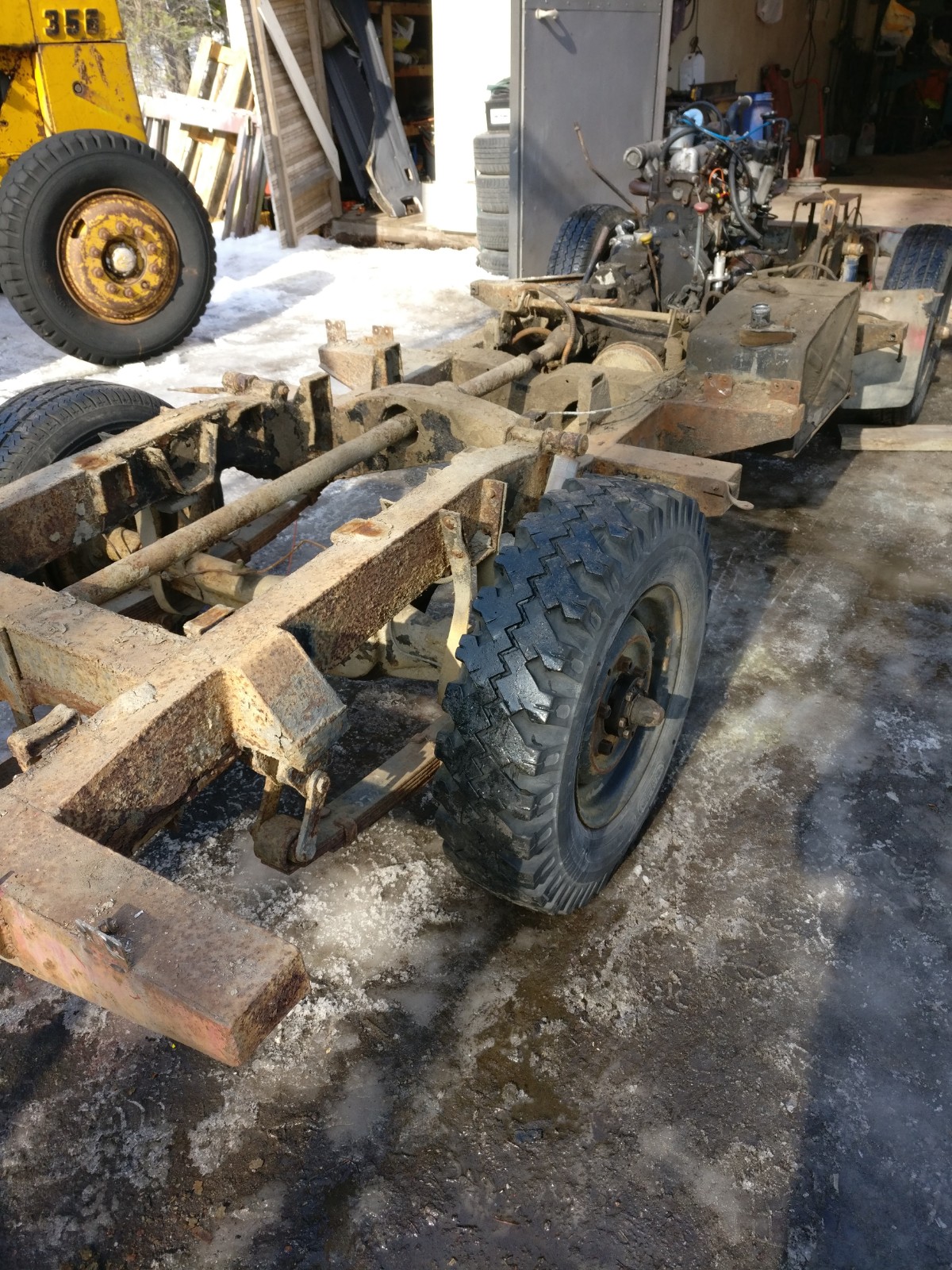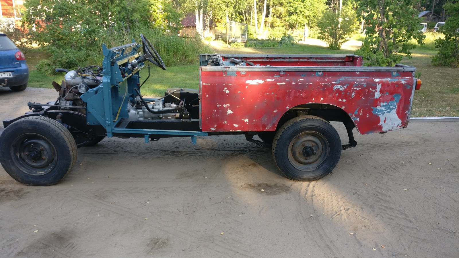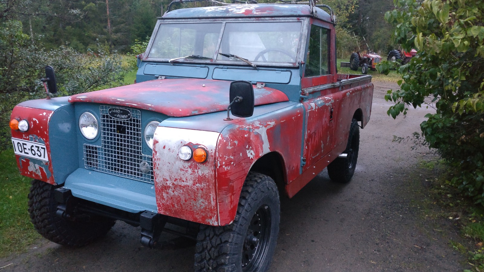 Land Rover Series 2A -68Jossain threadissa vilahti pyyntö, että lisää series-projekteja. No tässä ainakin yksi. Kyseessä on siis -68 vuosimallin 2A. Moottorina on toimii ikilaiska ja pirteä 2,25 D roverin diesel. Auto löytyi Etelä-Suomesta 2017 joulun alla, josta se sitten lavetilla siirrettiin pohjoiseen. Auto oli kerennyt seisoa ~15 vuotta, ennen kuin se minun omistukseen päätyi. Runko oli nähnyt parhaat päivänsä jo ajat sitten, mutta moottori pyörähti vauhtipyörän päästä käsin, joten toivoa oli. Lähtötilanne: -Runko laho siinä kohdin, missä sitä oli jäljellä -Kytkin jumissa -Jarrut kadonneet -Sisustasta puutui penkit ja se oli roiskittu vihreäksi, takaikkunoita myöten. -katto näyttää kuin sen päältä olisi laskettu liukumäkeä. (Ja näyttää edelleen. Jos jollain olisi myynnissä peltiosia, niin olen TODELLA kiinnostunut) -sähköt aivan jotain käsittämätöntä. +moottori tuntui liikkuvan +pellit on alumiinia. +Hyvät kesärenkaat, joilla ei todellisuudessa ollut mitään käyttöä, kun nappulat piti saada. +No onhan se kumminkin Land Rover. Joulun välipäivät (ja vähän aattoakin) vietetiin tiukasti tallissa. Moottoria elvyteltiin, jarruja heräteltiin henkiin, kytkin uusittiin. Moottorin elvytys tuotti monenlaista "iloa". Sähkö kulkusuunta oli hieman ollut jollekkin epäselvä, kun virta- ja maakaapeli tulivat molemmat samaan napaan startissa. Tämä vika paikantui savun saattelemana. Startti kuitenkin pyörähti iloisesti, kunhan johtojen päätepistetä hieman korjailtiin. Käyntisavuista ei kuitenkaan ollut mitään tietoa. CAV:in ruiskutuspumppu käytettiin pöydällä, mutta mitään vikaa ei löytynyt. Lopulta useiden ilmausyritysten jälkeen alkoi pakarin tiivisteen välistä nousta lupaava savu ja vanha dieseli pärähtikin tulille. Näin sivumennen sanoen, käynnistymisvaikeuksia ei ole tämän jälkeen ilmennyt. -30 asteen pakkasessakin kone heräsi reilun hehkutuksen jälkeen, kuin palmun alta. Savua kyllä sitten riitti. Niin paljon, ettei tallissa voinut olla. Sekin loppui kunhan hoksattiin, että pumpun ajoitus oli käännetty niin myöhäiseksi, kuin on mahdollista. No mehän laitettiin vastakkaiseen laitaan ja savut loppu. Jarru- ja kytkinremonttia sitten loppu loma, mutta varsinainen savotta alkoi joskus helmikuun tiennoilla. Autoa kuitenkin päästiin kokeilemaan tässä välissä ja todetiin, että neliveto ei pelaa. FAG. Syy löytyikin hyvin nopeasti, kun irroitin etuvetarit murikan irroitusta varten. Vasemmalta puolelta tuli vetari ilman booreja. 10cm palanen löytyi myöhemmin tasauspyörästöstä. Helmikuussa purettiin autosta kaikki pois rungon päältä. Akselit irroitettiin ja runko nostettiin kärryyn ja ajettiin hiekkapuhallukseen. Hiekkapuhalluksen jälkeen todettiin, että runko on todellakin laho joka kohdasta. Epätoivo hiipi otsalle, mutta eipä se auttanut kuin alkaa leikkaamaan peltiä ja hitsaamaan. Positiivista oli, että turhia muotoja ei ollut, vaan kaikki oli palkkirakennetta. Työ eteni kuitenkin suhteellisen nopeaa. Peltiä kului 2,5 m^2 ja lankaa tarvittava määrä. Hitsattu runko maalatiin pari kertaa epoksi- ja polyuretaanimaaleilla. Ainoa korotus, mikä autoon tehtiin, oli takimmaisten henkselien jatkaminen, jotta auto saatiin suoraan. Akselit takaisin runkoon joskus kesäkuussa (haave juhannusleimasta oli haihtunut jo aikaa sitten). Myös moottori ja laatikko paikalleen. Tässä välissä käytettiin laatikko irti ja vaihdettiin levy, joka olikin valmis vanhainkotiin. Tehtiin myös kaikkea muuta epäkiinnostavaa pikku hommaa. Kori päätettiin jättää suurimmaksi osaksi koskemattomaksi, koska metsästykausi alkoi painaa uhkaavasti päälle. Maalasimme kuitenkin tuli ja maskin. Elokuussa nostetiin kori takaisin paikalleen ja alettiin kasaamaan hilppeitä paikalleeen. Sähkötkin saatiin toimimaan, mutta vaati useita iltoja ja loputonta yleismittarilla oikean johdon etsintää. Polttoaineanturi, kaikki lamput ja lämpötila-anturi uusittin. Alkuperäinen puhallin sen sijaan toimii ja lämmittää. Sisätilat saivat uuden sisustuksen. Penkit löytyivät romuttamolta Peugot Boxerista tms. Sisustusken kanssa sattui semmonen "erehdys", että "unohdin" äänieristyksen. Lopputulos on, että pitkillä matkoilla Peltorit ovat pakolliset . Pitää tehdä asialle jtn talvella. Syyskuun puolessa välissä kaikki oli paketissa. Uudet rattaat alla. Tilasin Brittanniasta 16" vanteet ja niiden päälle kietaistiin Hankookin Dynapro MT RT03:set. Katsastusmies oli alkuun varsin nuiva, kun näki auton. Eihän se mikään kaunis olekkaan Ilme kyllä kirkastui, kun huomasi, että auto on oikeasti käyty huolella läpi ja ulkomuoto hieman pettää. Leima ekalla yrityksellä ja jarrutkin ekalla polkaisulla lävitte. Tulevana talvena sitten mahdollisesti maalausta ja muuta mihin nyt rahat riittää.