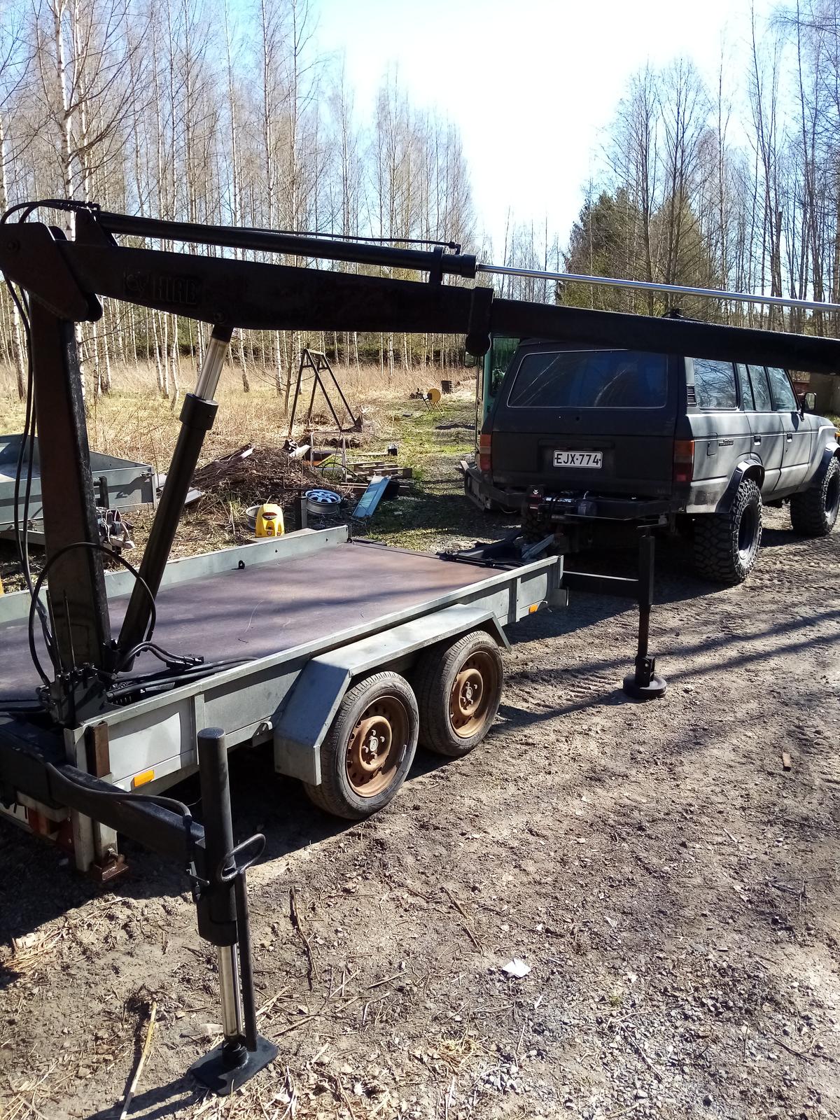 Maasturin nosturiperävaunuHydrauliikka voimanulosotosta. Aisalle sopii polttomoottorihydrauliikkayksikkö niin voi käyttää "normaali" autolla. Nosturirunko neljällä lavalukolla kiinni. Nousee omila jaloilla ylös niin kärryn voi ottaa muuhun käyttöön. Nostokyky 1600 kg.