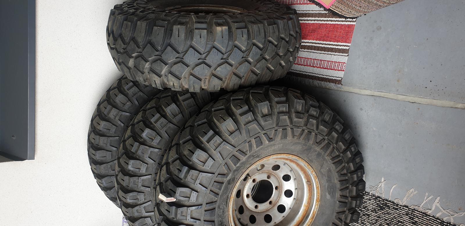 Vaihtaakkin voin 32-33' leveisiin samanmoisella vanteella oleviin hyväkuntoiseen rengassarjaan välirahan kera.