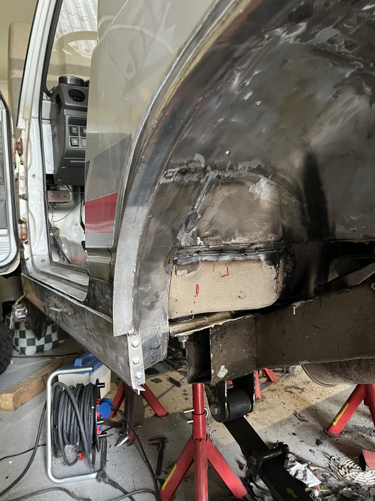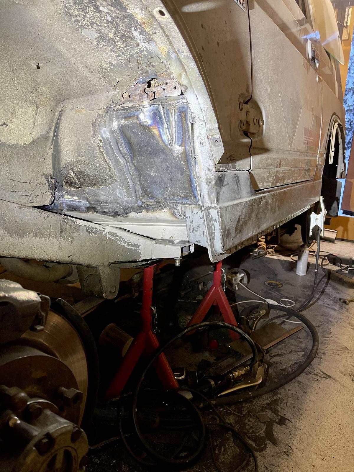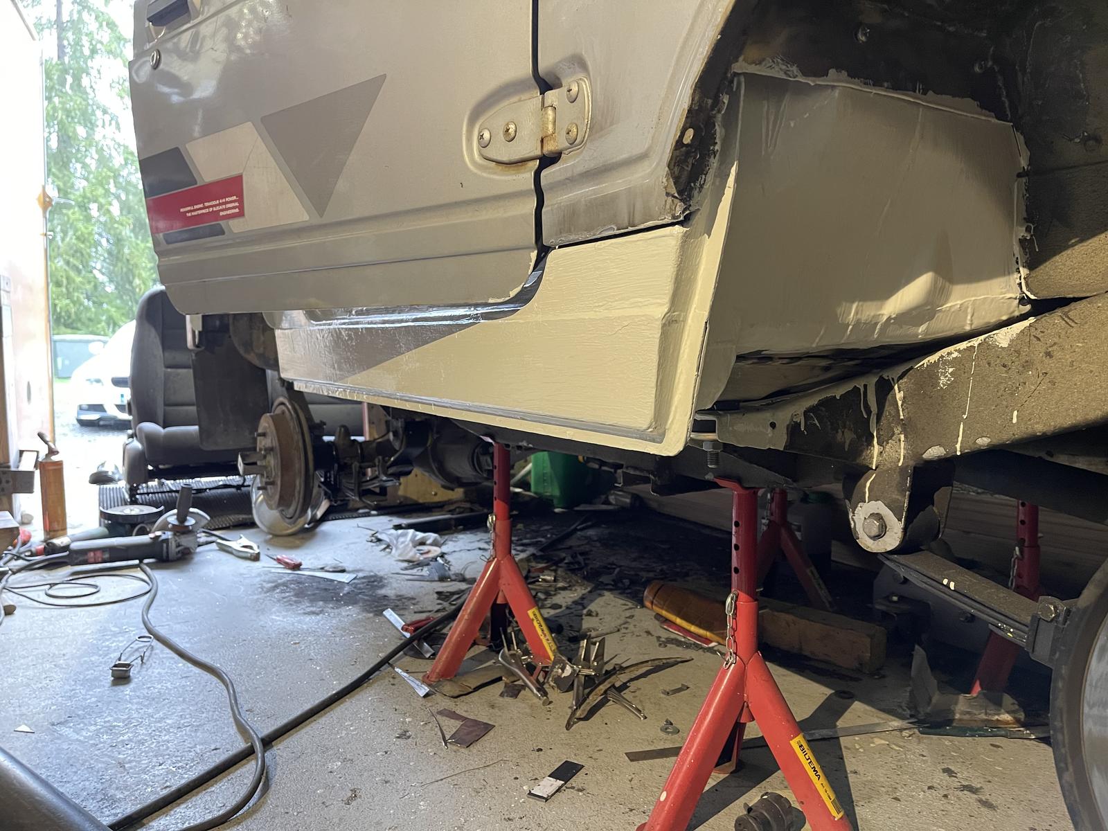 Kevään jälkeen oli tallissa hiljaista muutama kuukausi. Tuleva jahtikausi sai vähän vauhtia tekemiseen ja aloin tuossa toissa viikolla tekemään peltihommia loppuun. Suurimmat työt alkaa olemaan tehtynä. Muutamia pikkupaikkoja hitsaa vielä ja sitten ruveta puhaltamaan pohjaa ja maalailla. Taka-akselin joudun käyttämään irti vielä ja ruostereiät paikkailla siitä.