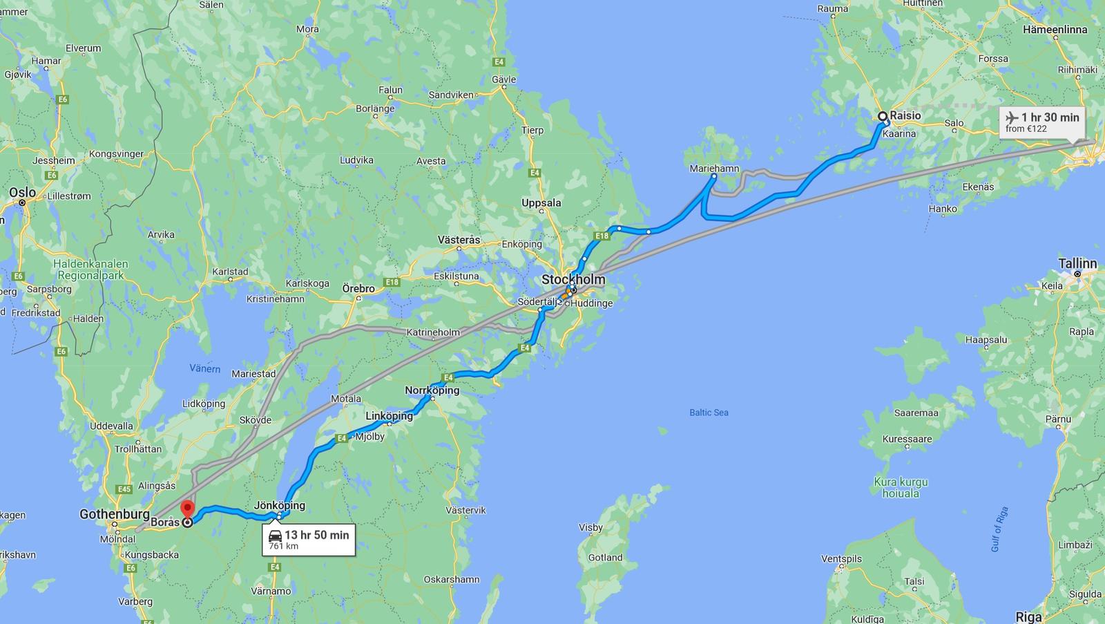 Ilmeisesti taloudellisin olis mennä Finnlinesil Naantalista Kapellskäriin ja siitä olis sitte n.500km Boråsiin.
