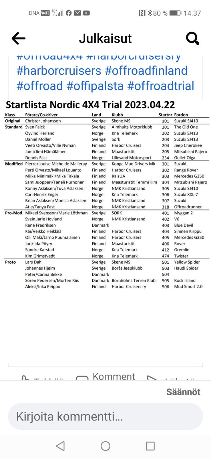Nordic Trial 22.4.2023 BoråsLaitetaan tänne asiaa 2023 PM kisasta eli Nordic Trial. Porukkaa on näillä näkymin lähdössä kisaan joka ajetaan 22.4.2023 Boråsissa Ruotsissa. Matkaan Finnlines lautalla Naantalista, ainakin näillä näkymin. Kommentteja saa laittaa ja lautavarauksen voisi tehdä kimpassa.