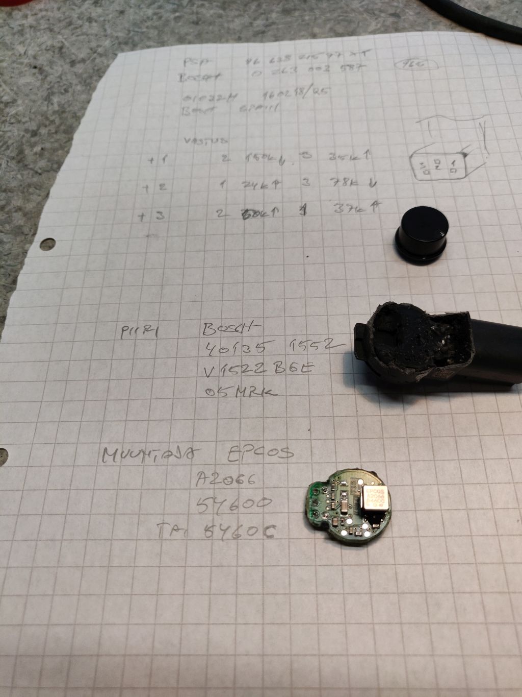 Tavoilleni uskollisena tein ruumiinavauksen anturille. Nettijuttujen mukaan luotettava diagnostiikka on mitata vastukset liittimen pinnojen välillä. Tässä eivät antaneet mitään hyödyllistä tietoa. Kaikki vastusarvot muuttuivat hissukseen eikä olut avoimia eikä oikosulussa olevia pinnejä.