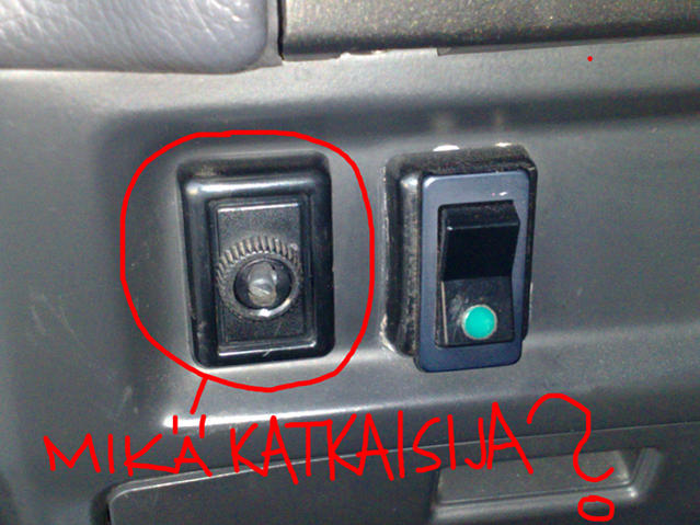 Mikä ihmeen katkaisija kojelaudassa?Hau hau ja hyvää kesää kaikille! Tuli tässä tuijoteltua kojelautaa ja tajusin, ettei ole hajuakaan mikä katkaisija tuo toisen kuvan vasemman puoleinen on. Katkaisijalta lähtee kaksi sinistä johtoa, joista toinen tulee tuohon sulakkeeseen joka on laturiin ankkuroituna. Toisen johdon loppupäätä en ole vielä ehtinyt selvittää. Katkaisija sijaitsee kuskin puolella oven vieressa sulakeboxin yläpuolella. Onko kenelläkään antaa vinkkiä ennenkuin menen repimään muka turhan johdon irti ja seuraavana yönä auto palaa oikosulun takia? Biili on HJ-61. Kiitos ja anteeksi. ...Niin ja se sulake on 15 A. -edittiä teknisiin termeihin, kun ei tyhmä ekalla kerralla saa oikein-