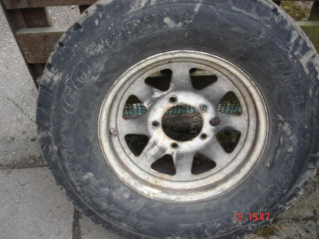 Siinä kuva. Vanteet ovat susukin ja voi laittaa kumminpäin tahansa ja kumit ovat Colway 235/75x15 ja pintaa 11-12mm. Mulla noi oli justiinsakin Nivan alla jonkun aikaa pyörimässä kunnes kävivät pieniksi.