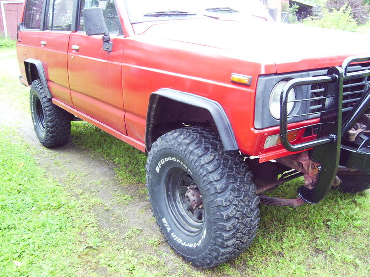Profiilissa uusia sisäkuvia. Melkein valmis, puuttuu vielä vinssin käyttövipu ja taakse putkipuskuri ja katsastus. Takaluukku on täysin mätä, siksi vedetty mustaksi. Renkaita saa sopimuksen mukaan joko 33x12.5x15 BFG mt tai 33x13.5x15 swamperit tai 285/75-16 Hankook tai kaikki nuo+235/75-15 Nokian nastat talveksi. Kuvissa alla lukkovanteilla 205 joilla käydään ilmeisesti leimalla? Takaakseli näköjään joustaa ihan hyvin mutta etuakseli on aika tönkkö.