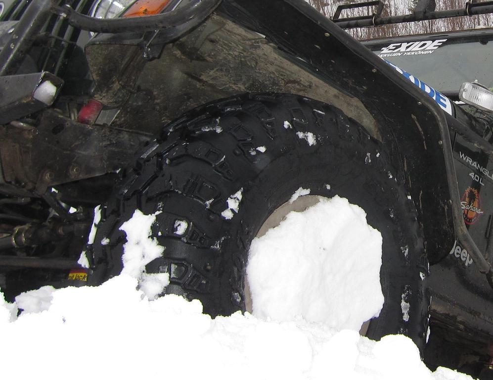 Juu siis 15" kumit ja olleet 10" beadlock vanteilla. Leveys 14". Hyvin eteni talvieksytyksessä. Otan paremman kuvan kun pääsen käymään tallilla.