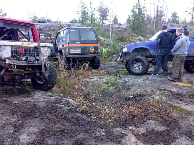 Ihan hiukka nuiljakkaat oli kalliot ja paikoitellen kuulemma syvääkin ![]() Ilman suurempia kalustovaurioita selvittiin. 1kpl irronnut tulpanjohto ja traikulle ajaessa huomasin etuperän peltikuoren pikkusen saaneen kipeetä.