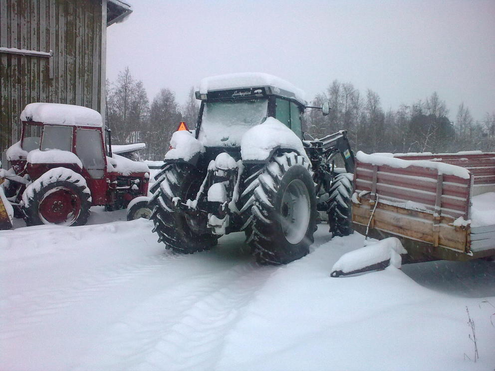 Tossa kaverin kännykällä nappaama paska kuva, otan parempia kun löydän kameran. Voihan noi urkit kestää, mutta kankee vehje se on. Eli tilaa vaatii, Ja tuossa on renkaat aika finaalissa. Etu kuormaaja on irti että mahtuu paremmin lumia lanaamaan.Kuormaaja oli pika james 1300 muistaakseni. Ei mikään äärimmäisen vahva, nostaa henkilömallin BMW:n kyllä romulavalle ja 1000kg säkit kärrystä