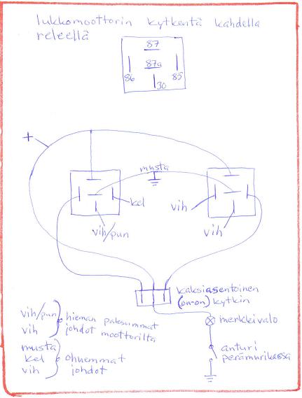 Voit myös heittää ne alkuperäiset sähköt niistä lukkojen ohjauksista kuubaan ja teet tollasen kahden releen kytkennän, lukko toimii silloin riippumatta muista lukoista.
