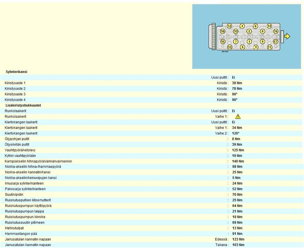 2L-T momentti arvoja?eli tässä on pientä keväthuoltoa käynnissä ja pari momenttikymysystä askarruttaisi. joten jos joku viitsisi jostain manuaalista vilkaista momentit 1.kannenpulteille 2.nokka-akselipukeille niin olisin kiitollinen. kannenpulttien kiristysjärjestyskin toki kiinostaa.